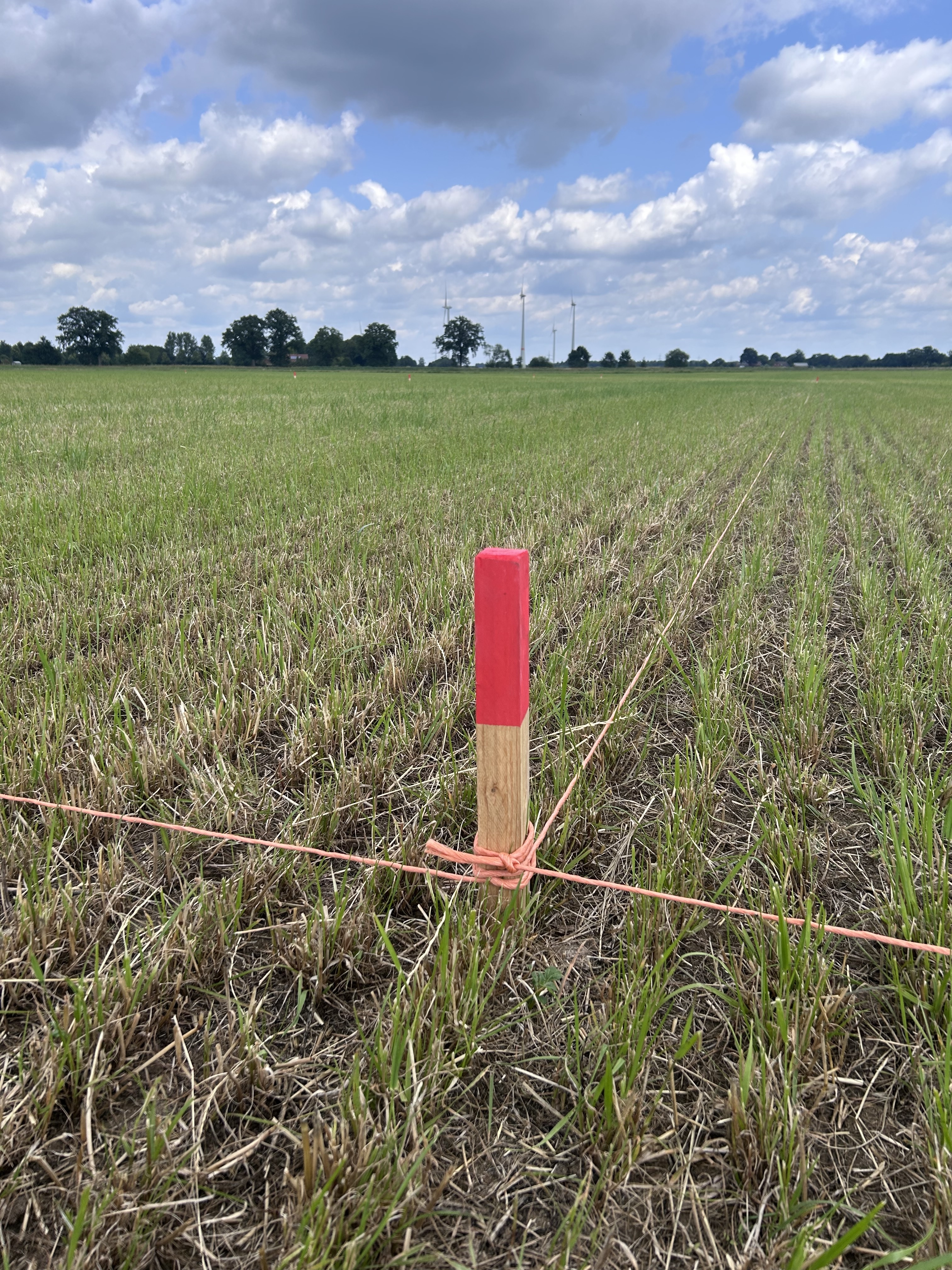 Während der angehende Geomatiker den Plan kartografisch in Form und Fassung brachte, kümmerten sich die zukünftigen Vermessungstechniker um den Außendienst. Auch die Freiwillige Feuerwehr Wagenfeld arbeitete zu, indem sie das Zeltlagergelände zugänglich machte – kurz: Es musste erst einmal Gras gemäht werden. Für die Absteckung vor Ort nutzten die Auszubildenden den Satellitenpositionierungsdienst SAPOS, mit dem sie die zuvor berechneten Koordinaten sämtlicher Zeltplatzecken lokalisierten. Durch das Markieren mit Pflöcken und das Spannen von Strohband wurden die Zeltplätze im Gelände schließlich sichtbar gemacht. „Zu sehen, mit welchem Einsatz sich unsere Azubis auf den letzten Metern ins Zeug gelegt haben, um sich als Team für dieses Event zu engagieren, macht mich echt stolz!“ resümiert Julia Feußahrens (LGLN).