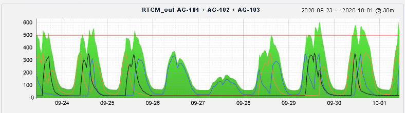 Mit etwa 70 Prozent bildet die Kundengruppe „Land- und Forstwirtschaft“ die stärkste Nutzergruppe und zeigt, dass das Ziel der Landesregierung schon nach kurzer Zeit erreicht wurde, die SAPOS-Daten als Teil der „Schlüsselressource Geobasisdaten“ der heutigen Gesellschaft bereit zu stellen. Die Abbildung 2 zeigt eine Übersicht der letzten sieben Tage mit deutlichen Tages- und Wochenschwankungen. Als besonderes Augenmerk sei auf das „Mittagsloch“ hingewiesen (auch SAPOS-Nutzende pflegen offenbar ein gemütliches Mittagessen).