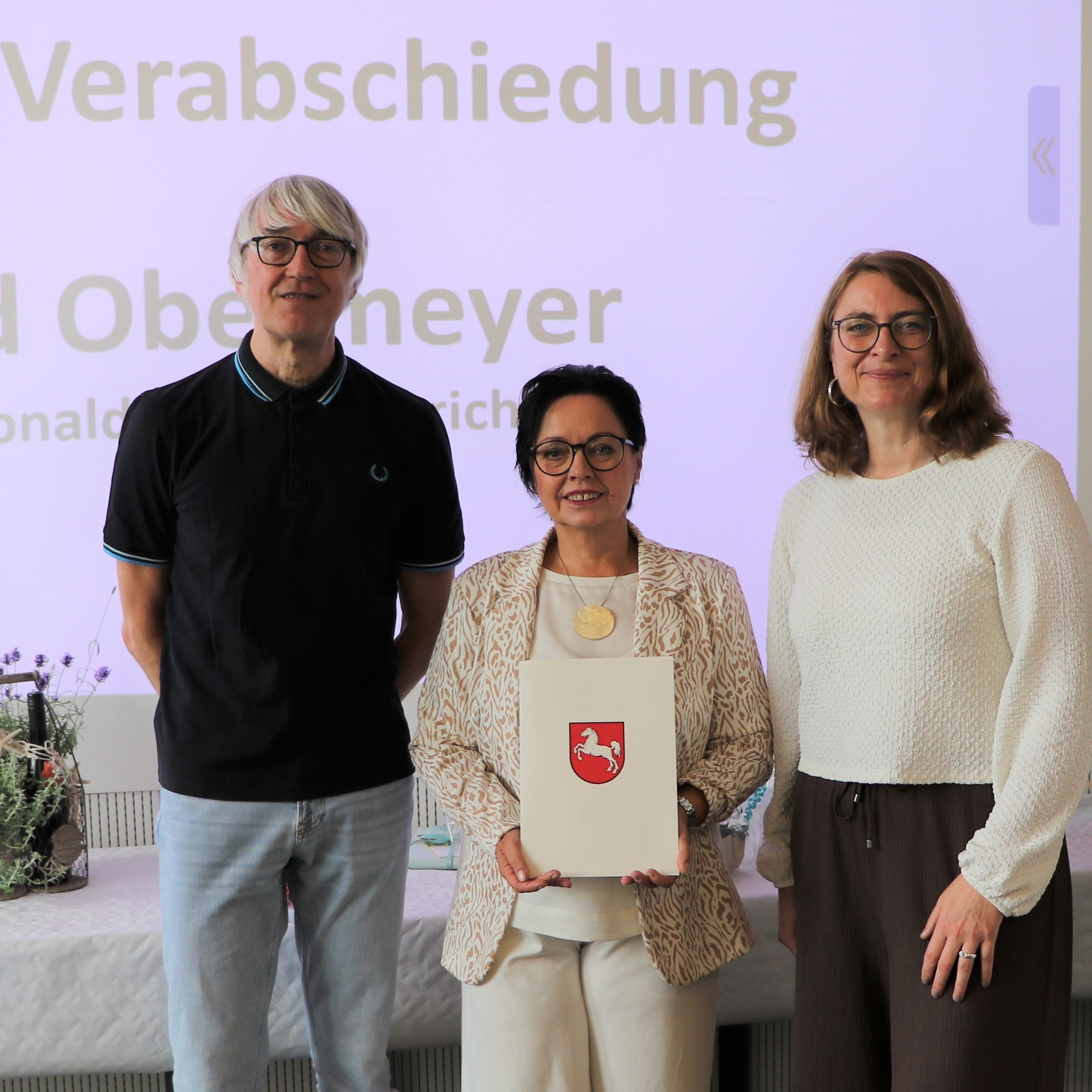 Im Namen der Niedersächsischen Innenministerin Daniela Behrens überreichte die zuständige Referatsleiterin Katrin Steffens die obligatorische Urkunde, nicht ohne zuvor auf die 32jährige Berufslaufbahn von Helgrid Obermeyer zurückzuschauen. „Was Sie ausgezeichnet hat, war unter anderem eine enorm positive Ausstrahlung, Ihr unermüdlicher Einsatz für die Beschäftigten Ihrer Regionaldirektion und Ihre unbedingte Zuverlässigkeit“, hob Steffens in ihrer Laudatio hervor. Die Ministerialrätin erinnerte an den Laufbahnwechsel Obermeyers von der Agrarstruktur- in die Vermessungsverwaltung und betonte, dass allseits voller Anerkennung auf ihre Leistungen zurückgeblickt werde.