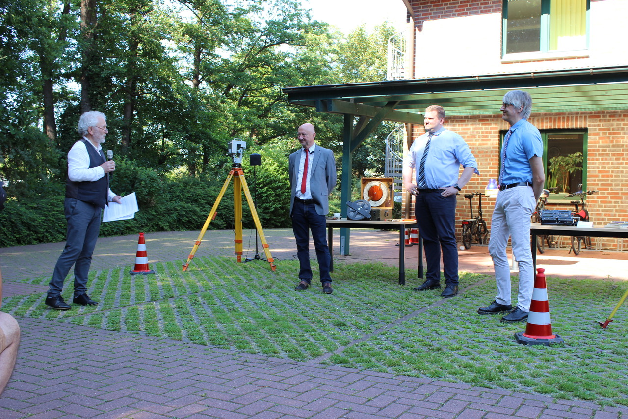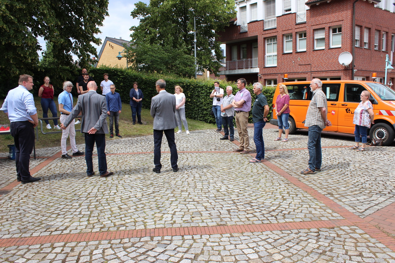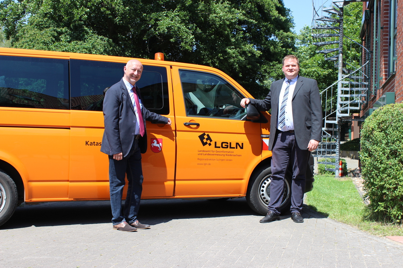 Am Freitag, 26. Juni 2020, hätte sie stattfinden sollen, die offizielle Amtsübergabe der Leitung der Regionaldirektion Sulingen-Verden des LGLN von Helmut Weiß an Thomas Schaefer im würdigen Rahmen mit vielen Gästen. Sie fiel der Corona-Pandemie zum Opfer. Stattdessen reisten der alte und der neue Regionaldirektionsleiter am Donnerstag (25. Juni) vier der insgesamt sechs Katasterämter der Regionaldirektion in Syke, Verden, Fallingbostel und Soltau an und haben sich in „Hofgesprächen“ würdig von ihren insgesamt gut 200 Mitarbeitenden und Auszubildenden verabschiedet beziehungsweise sich ihnen vorgestellt. Begleitet wurden sie dabei vom Präsidenten des LGLN, Michel Golibrzuch. Am Freitag folgte das „Hofgespräch“ im Katasteramt Nienburg und das offizielle Pressegespräch am Hauptsitz der Regionaldirektion in Sulingen mit nachfolgendem „Hofgespräch“.