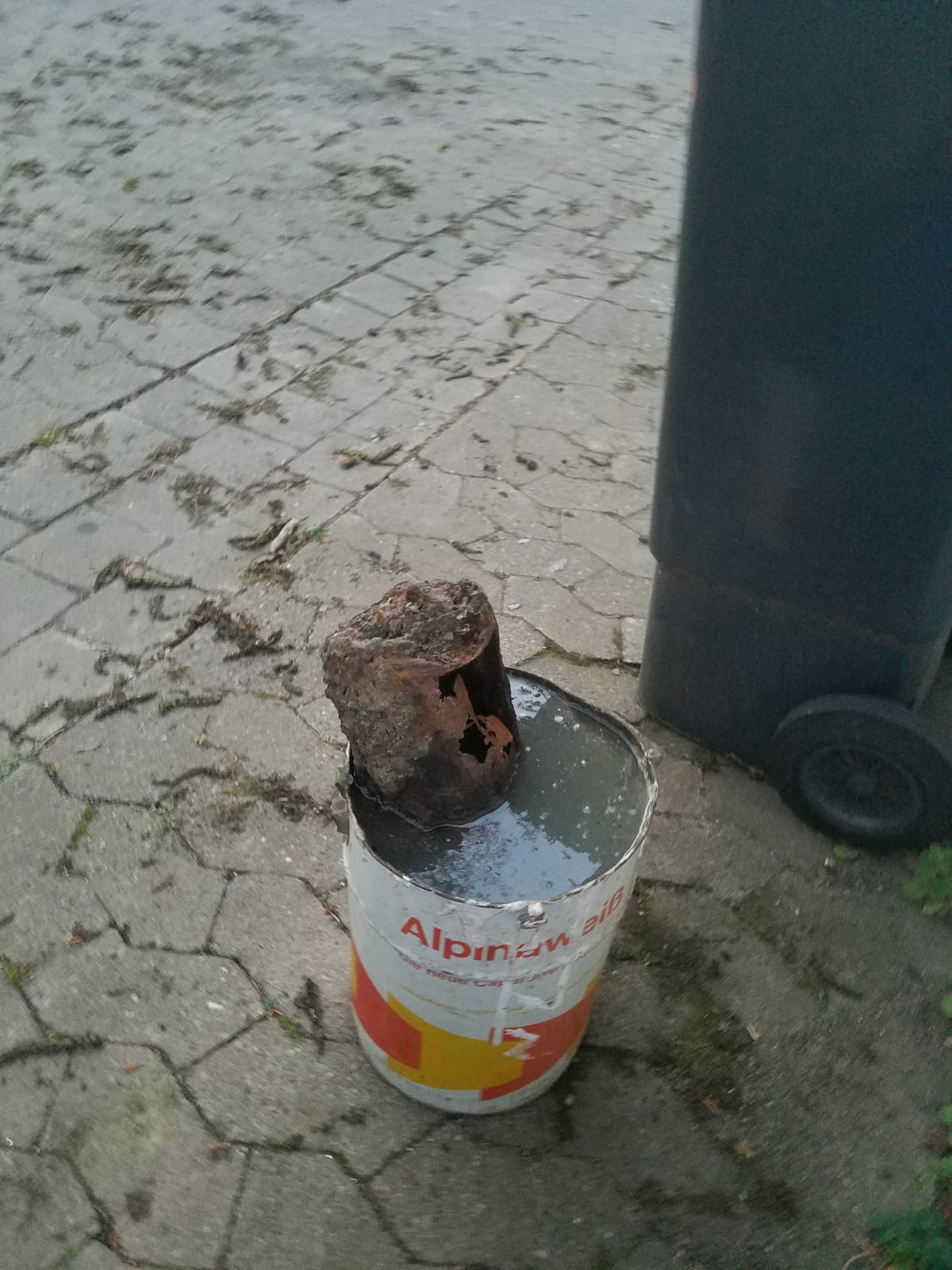 27.04.2020 Vater und Sohn finden Phosphorbrandbombe beim Magnetangeln und nehmen sie mit nach Hause. Als sich später weißer Phosphor in der Bombe selbst entzündet, werden drei Personen verletzt. (Phosphorbrandbombe wird im Eimer gelöscht, siehe Bild 1)
